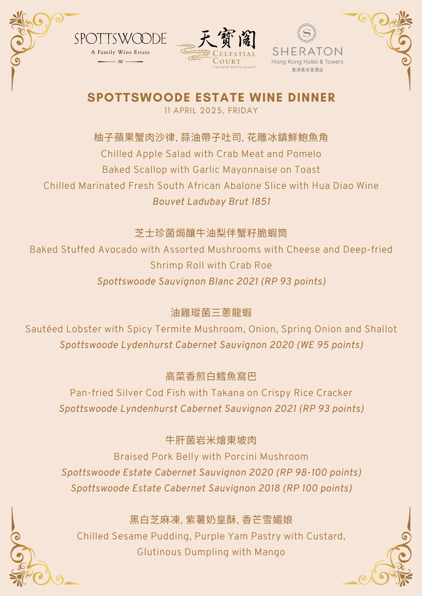 Spottswoode Estate is ahistorical and family-owned Napa winery with estate vineyards renowned for itssignature Cabernet Sauvignon. We are pleased to present a 6-course pairing menufeaturing 5 top-rated Spottswoode wines, with one of the highlights being the 100points Spottswoode Estate Cabernet Sauvignon 2018 and Spottswoode EstateCabernet Sauvignon 2020.
